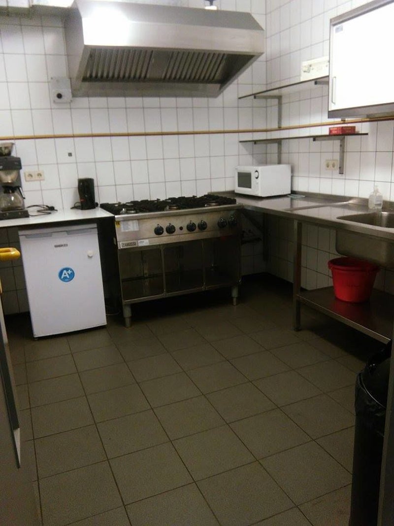 De keuken heeft een 6 pits horeca gasstel, een dubbele spoelbak, aanrecht/werkblad en een koelkast.